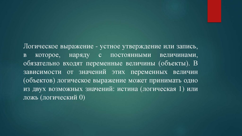 Логическое выражение - устное утверждение или запись,в которое, наряду с постоянными величинами,