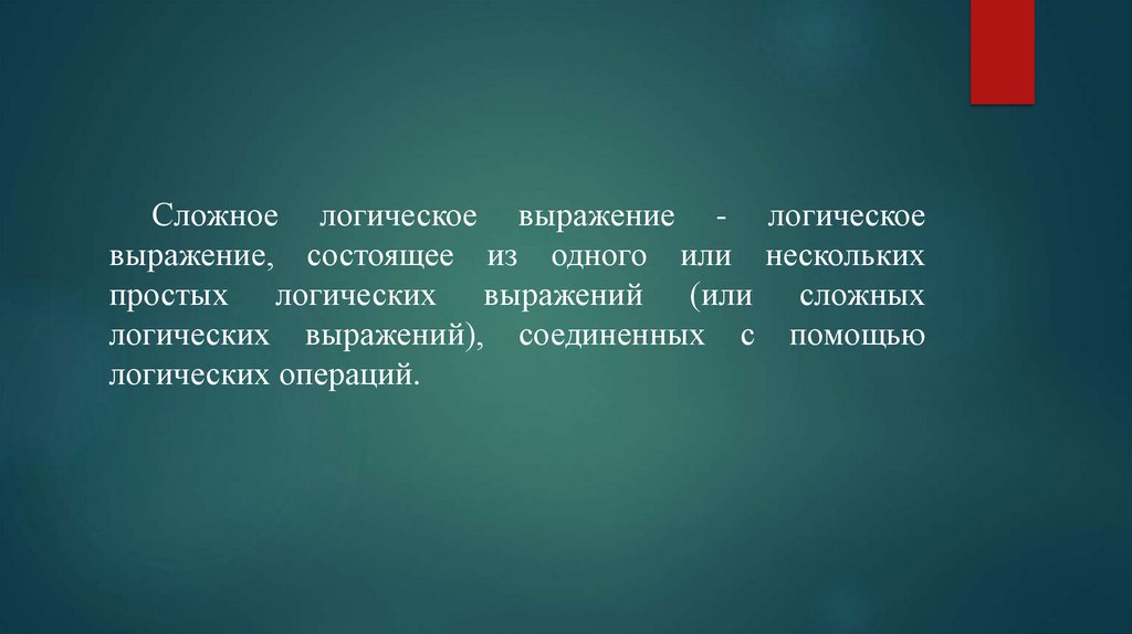 Сложное логическое выражение - логическоевыражение, состоящее из одного или нескольких