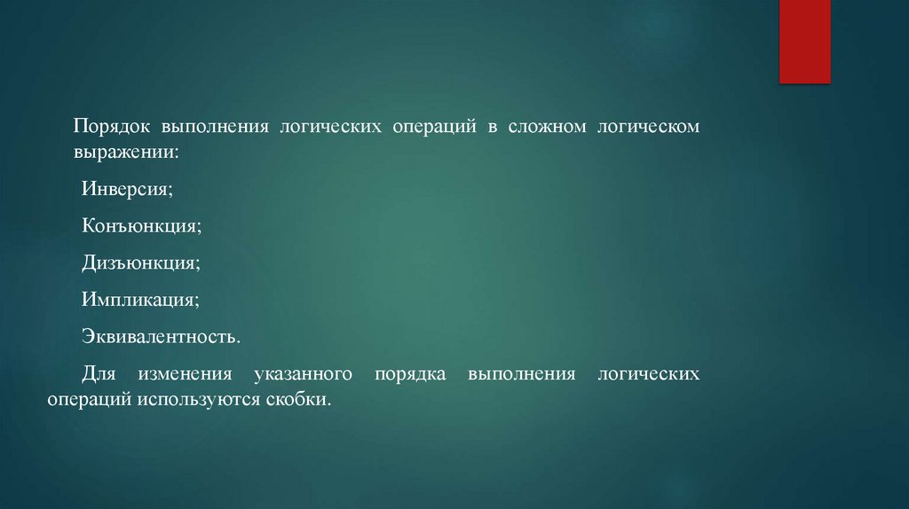 Порядок выполнения логических операций в сложном логическомвыражении: