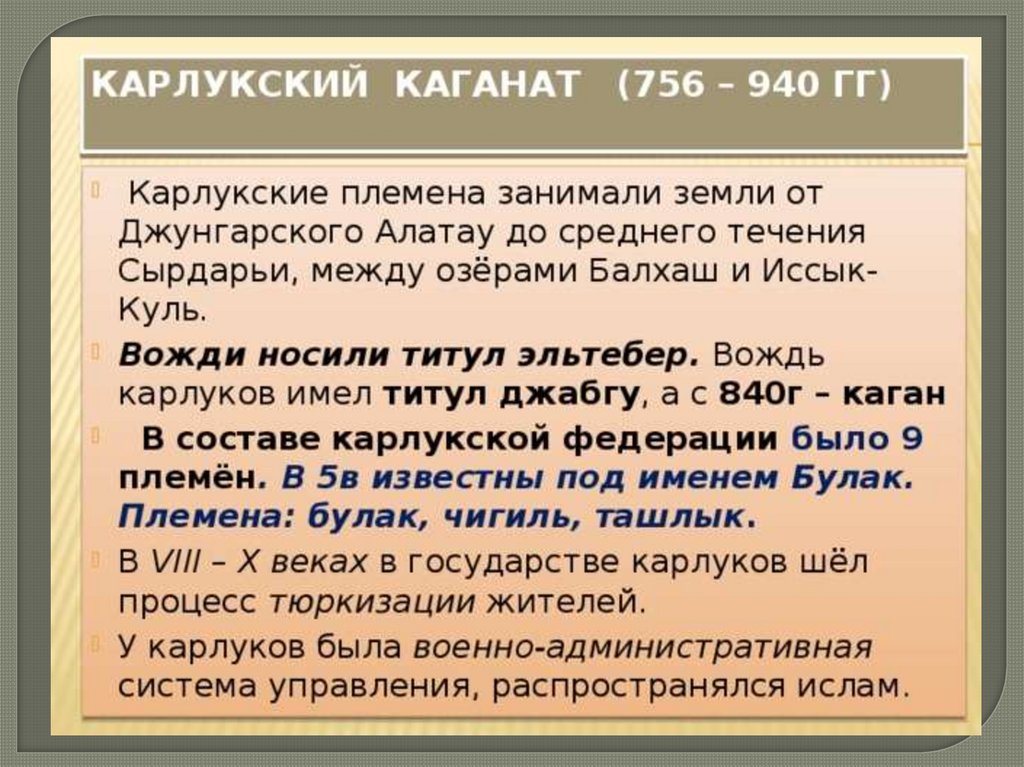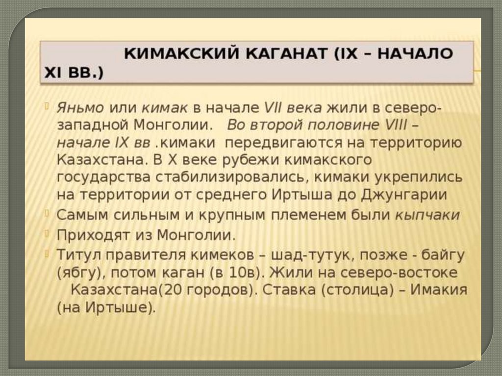 В конце IX в. на территории Северо- восточного и Центрального Казахстана образовываетсяКимакский каганат.