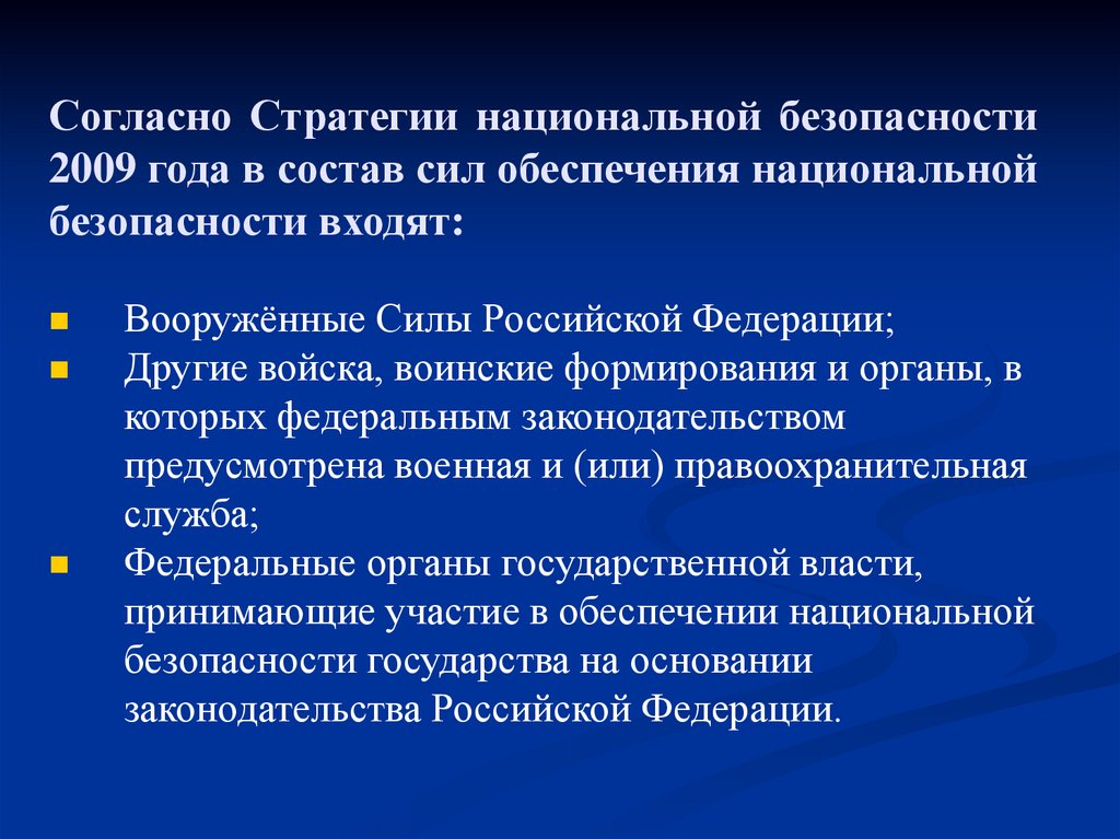 Согласно Стратегии национальной безопасности2009 года в состав сил обеспечения национальной