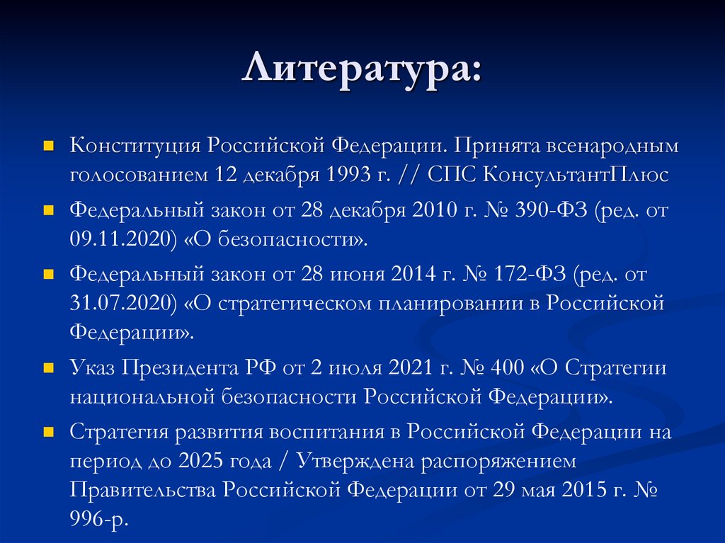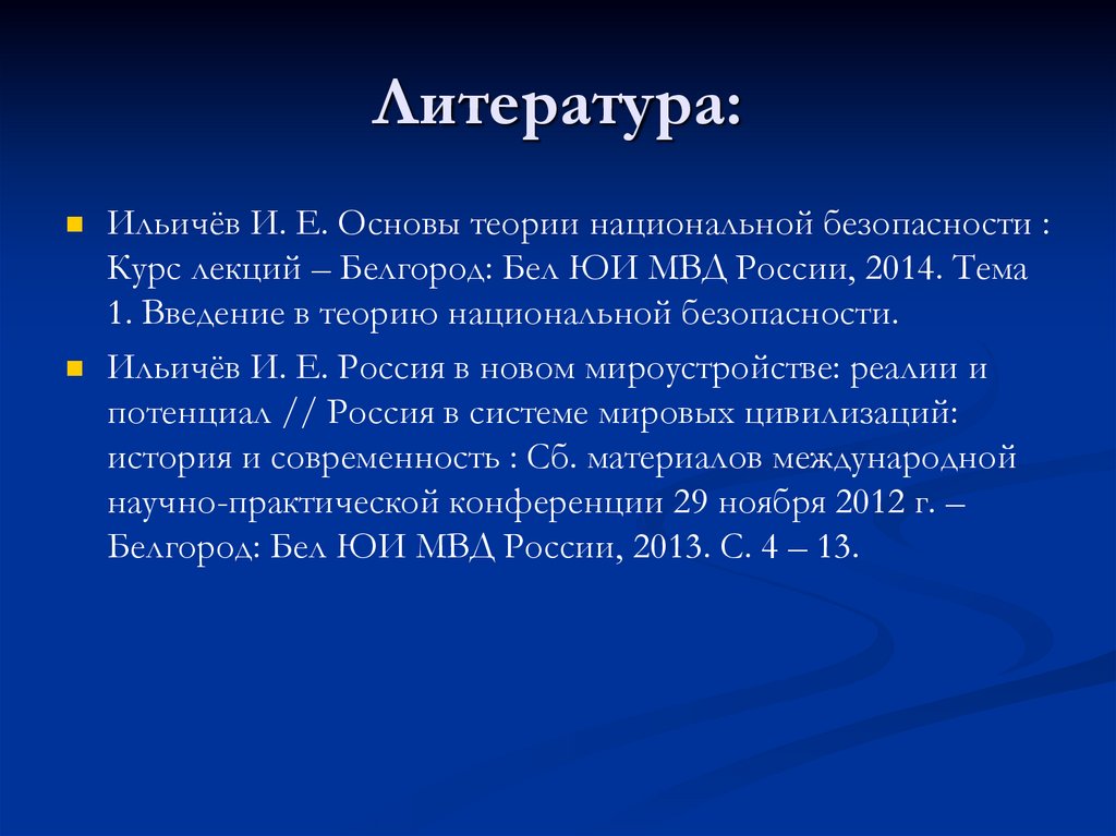 Литература:Ильичёв И. Е. Основы теории национальной безопасности :