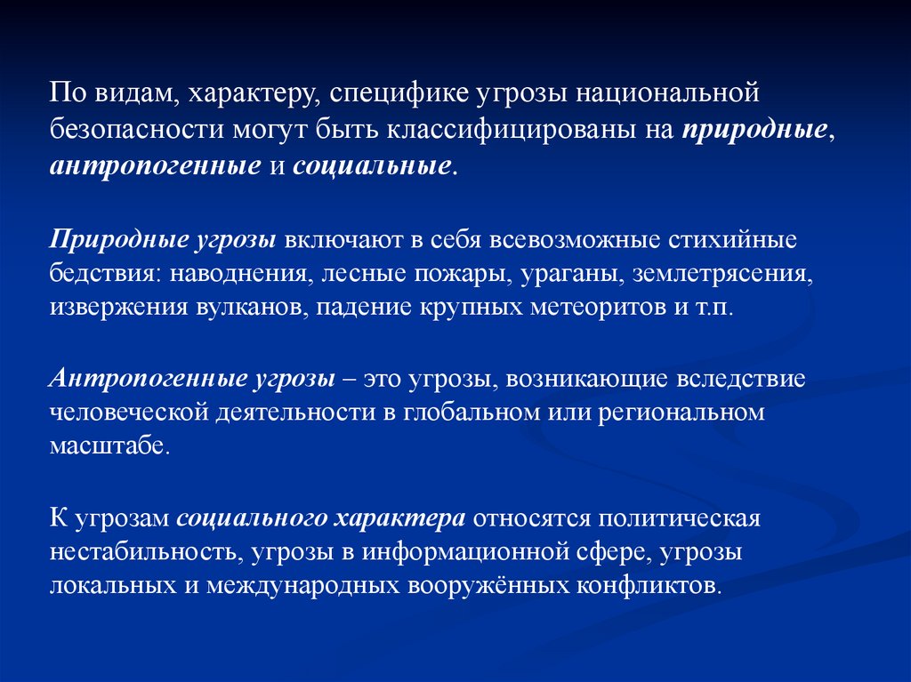 По видам, характеру, специфике угрозы национальнойбезопасности могут быть классифицированы на природные,