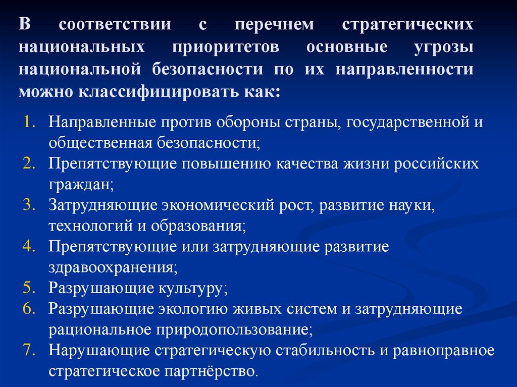 В соответствии с перечнем стратегическихнациональных приоритетов основные угрозы