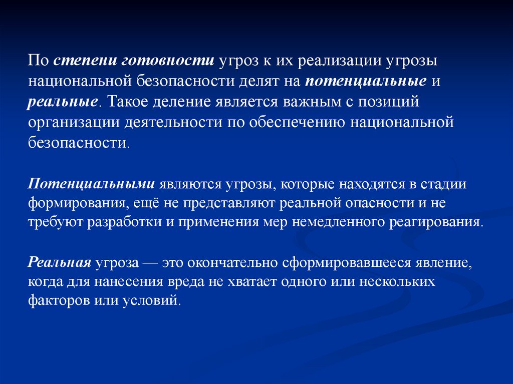 По степени готовности угроз к их реализации угрозынациональной безопасности делят на потенциальные и