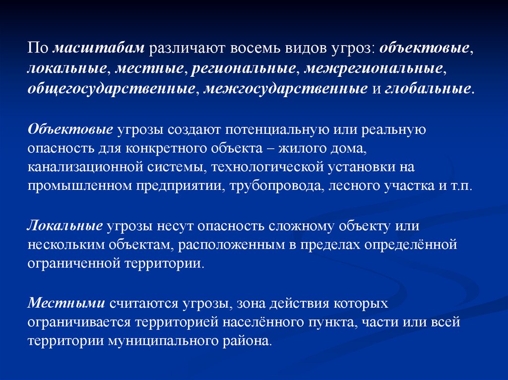 По масштабам различают восемь видов угроз: объектовые,локальные, местные, региональные, межрегиональные,