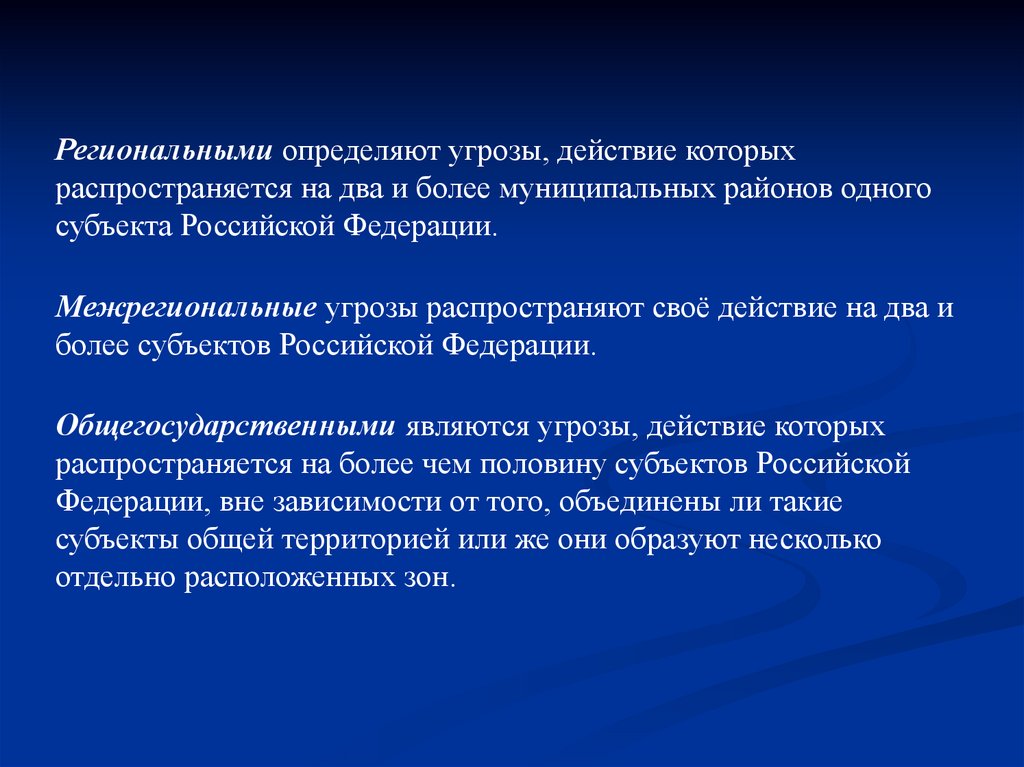 Региональными определяют угрозы, действие которыхраспространяется на два и более муниципальных районов одного