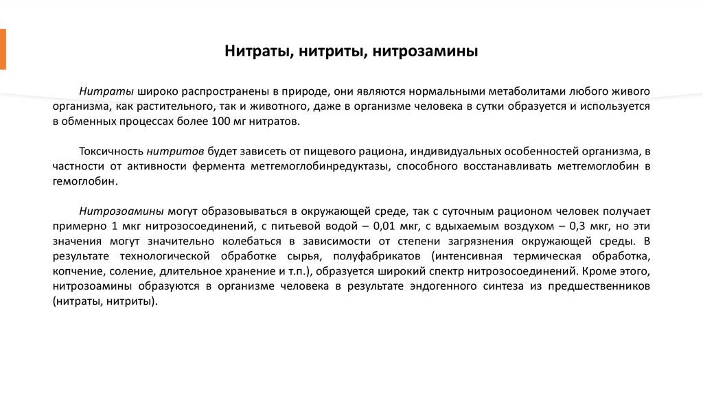 Нитраты, нитриты, нитрозаминыНитраты широко распространены в природе, они являются нормальными метаболитами любого живого