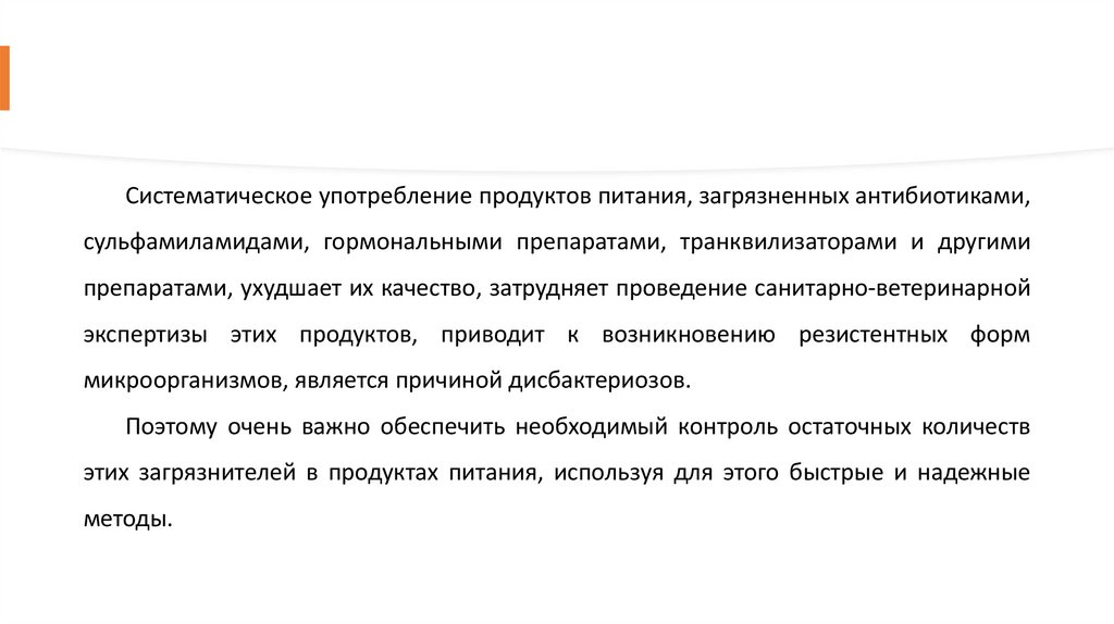 Систематическое употребление продуктов питания, загрязненных антибиотиками,сульфамиламидами, гормональными препаратами, транквилизаторами и другими