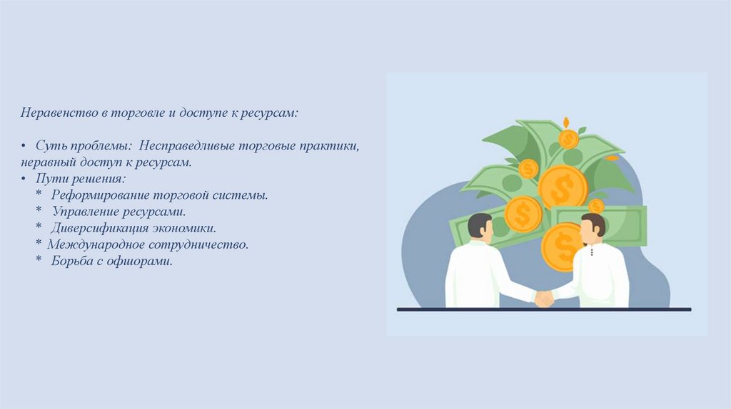 Неравенство в торговле и доступе к ресурсам:• Суть проблемы: Несправедливые торговые практики,