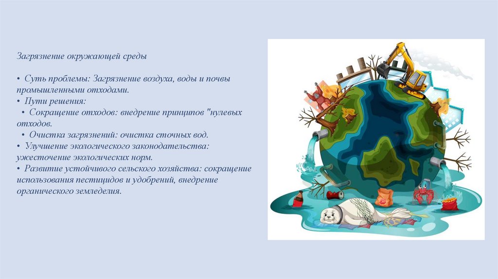 Загрязнение окружающей среды• Суть проблемы: Загрязнение воздуха, воды и почвы
