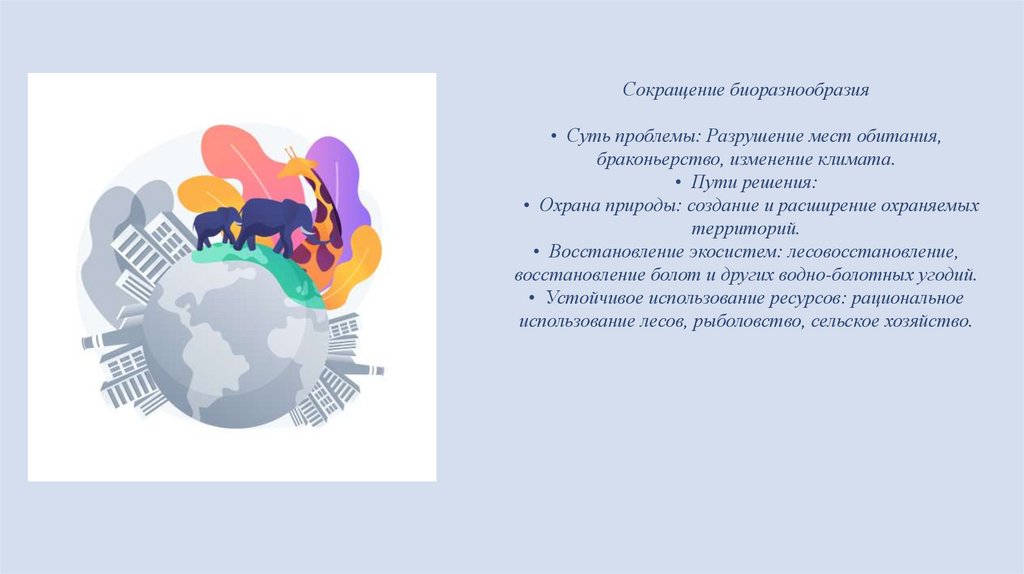 Сокращение биоразнообразия• Суть проблемы: Разрушение мест обитания,