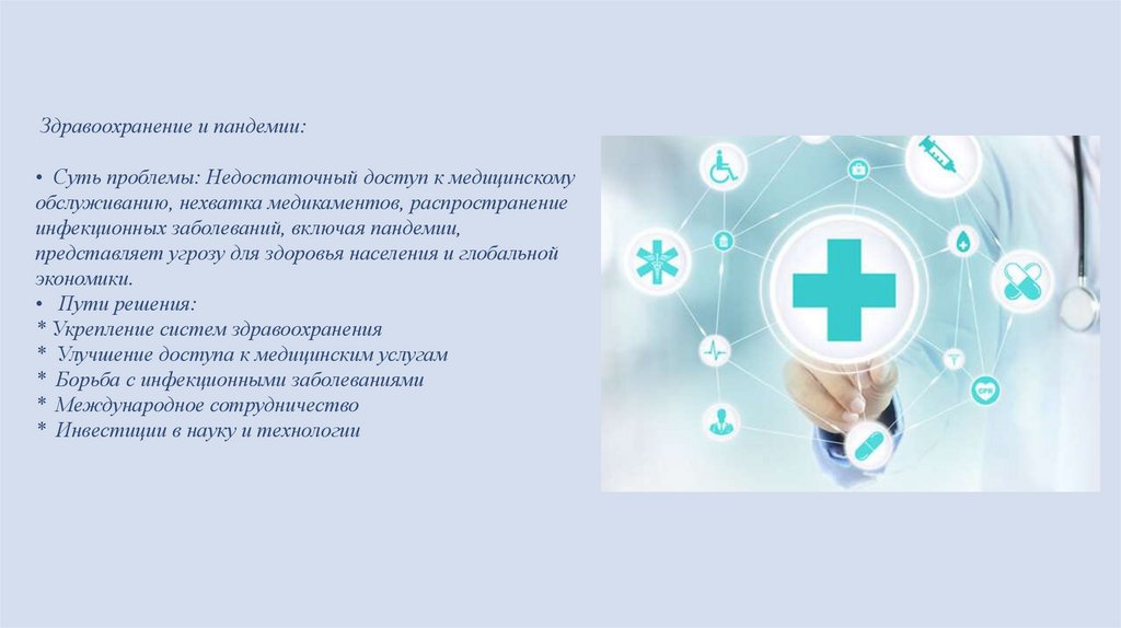 Здравоохранение и пандемии:• Суть проблемы: Недостаточный доступ к медицинскому