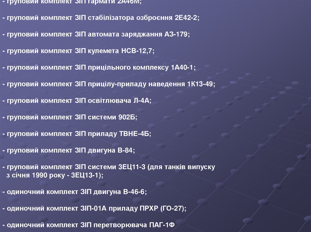 - груповий комплект ЗІП гармати 2А46М;- груповий комплект ЗІП стабілізатора озброєння 2Е42-2;