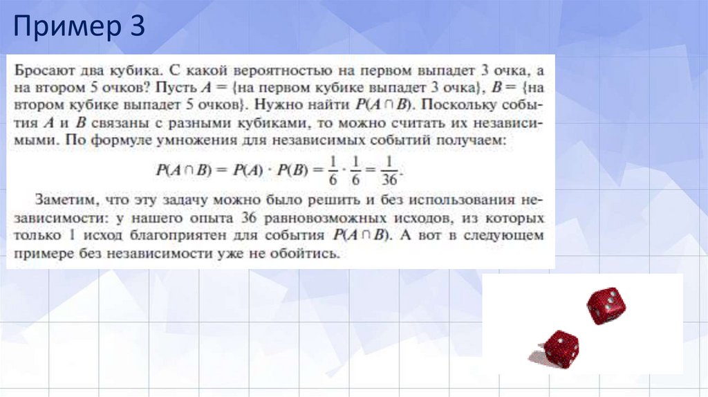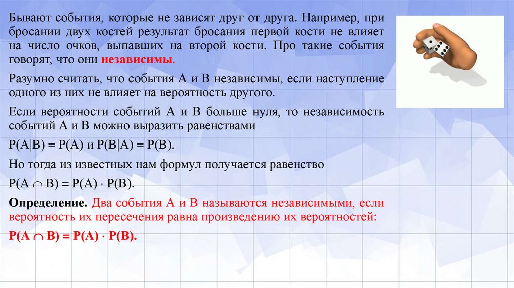 Бывают события, которые не зависят друг от друга. Например, прибросании двух костей результат бросания первой кости не влияет