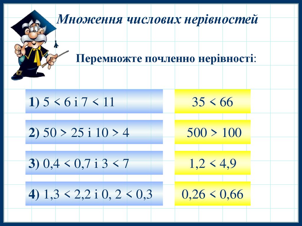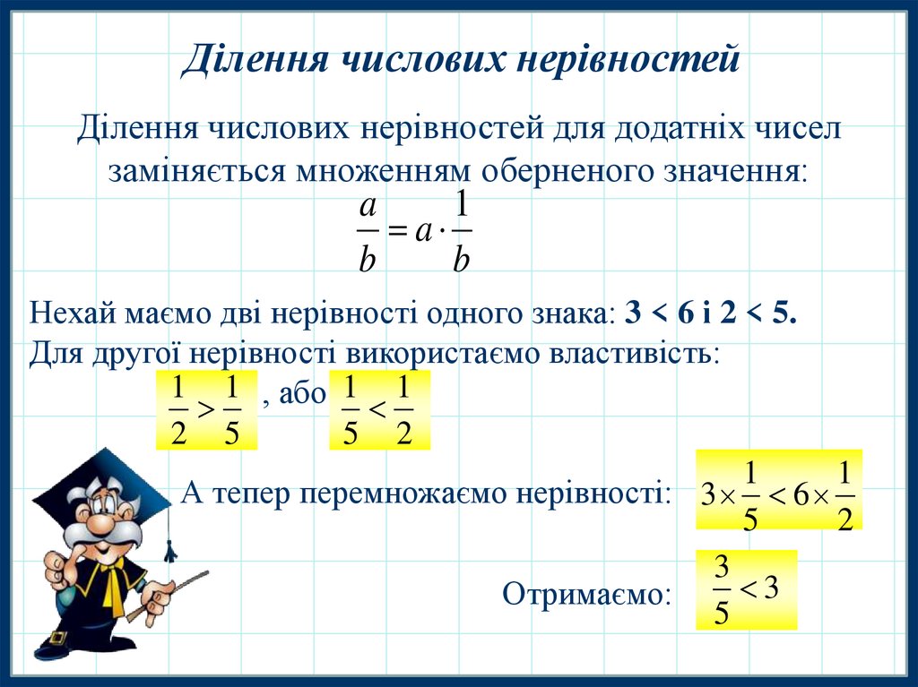 Ділення числових нерівностейДілення числових нерівностей для додатніх чисел