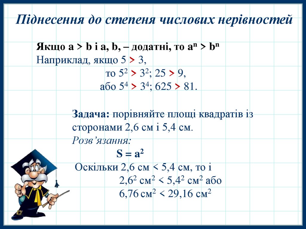 Піднесення до степеня числових нерівностейЯкщо a > b і a, b, – додатні, то an > bn