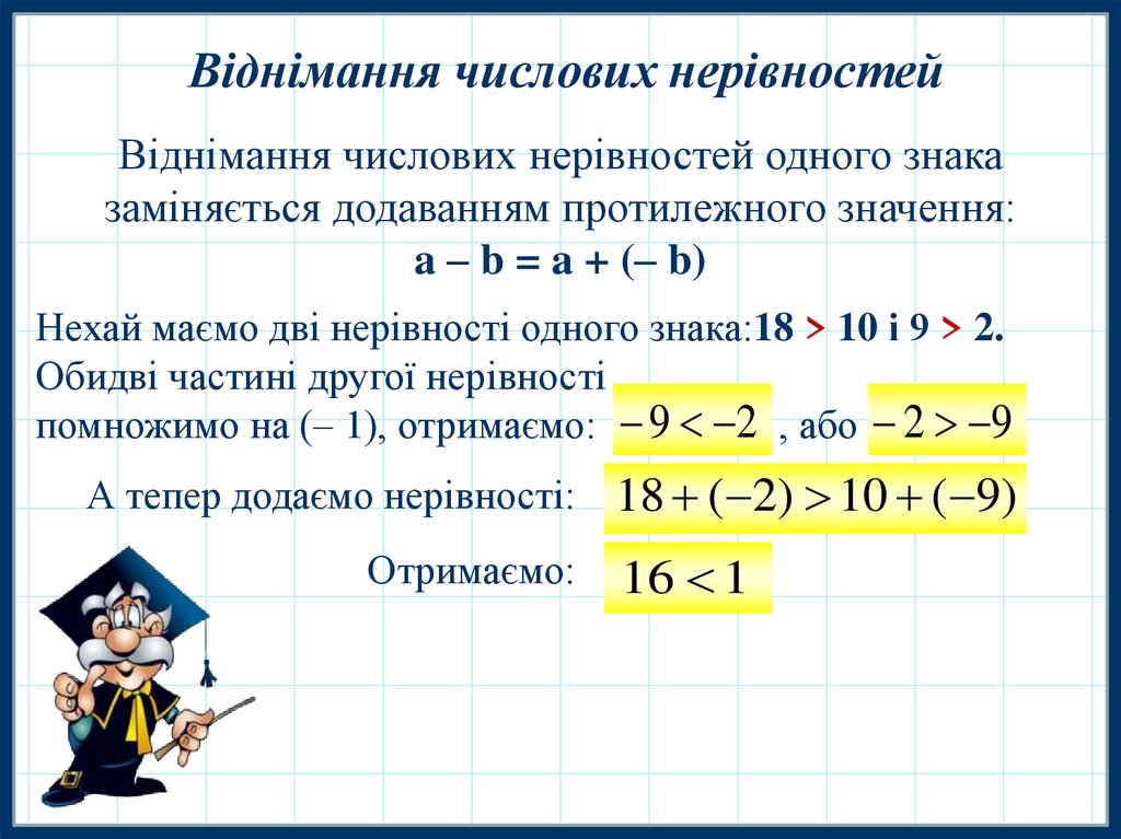 Віднімання числових нерівностейВіднімання числових нерівностей одного знака