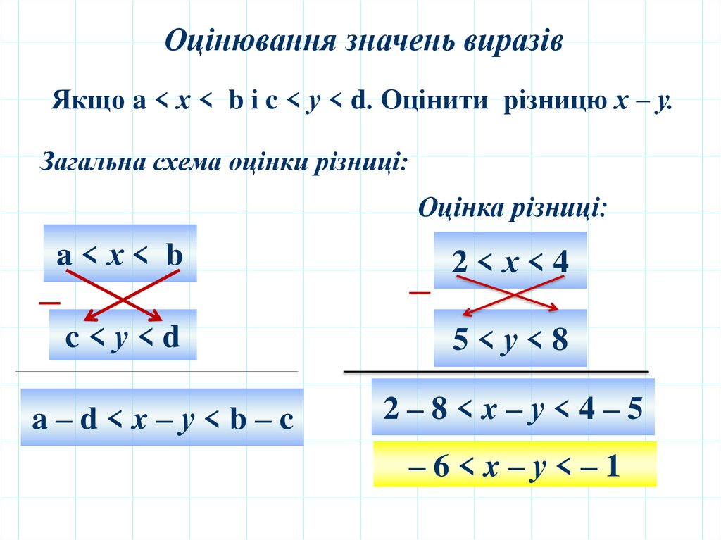 Оцінювання значень виразівЯкщо a < х < b і c < у < d. Оцінити різницю х – у.
