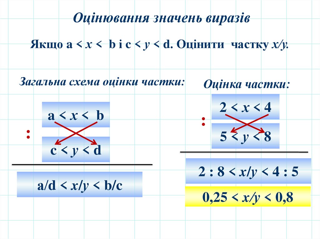 Оцінювання значень виразівЯкщо a < х < b і c < у < d. Оцінити частку х/у.