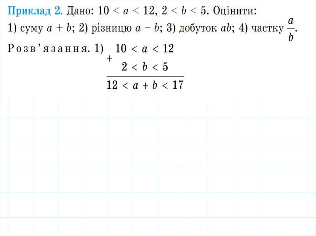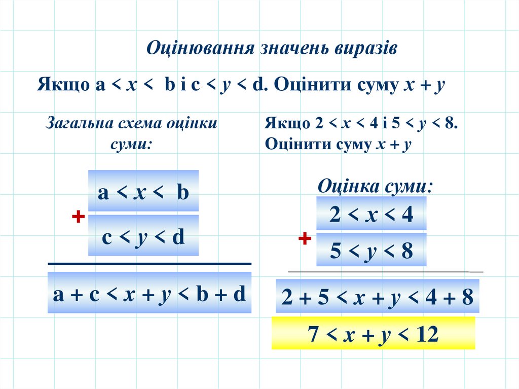 Оцінювання значень виразівЯкщо a < х < b і c < у < d. Оцінити суму х + у