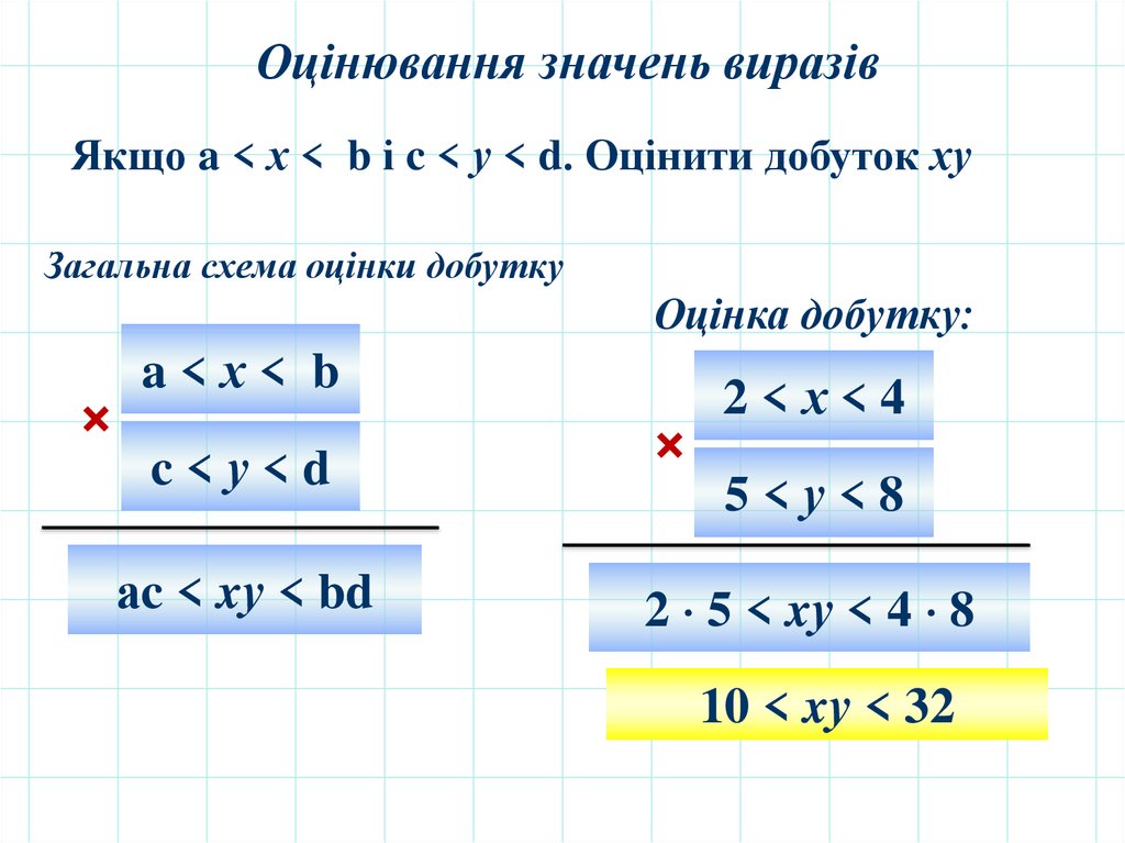 Оцінювання значень виразівЯкщо a < х < b і c < у < d. Оцінити добуток ху