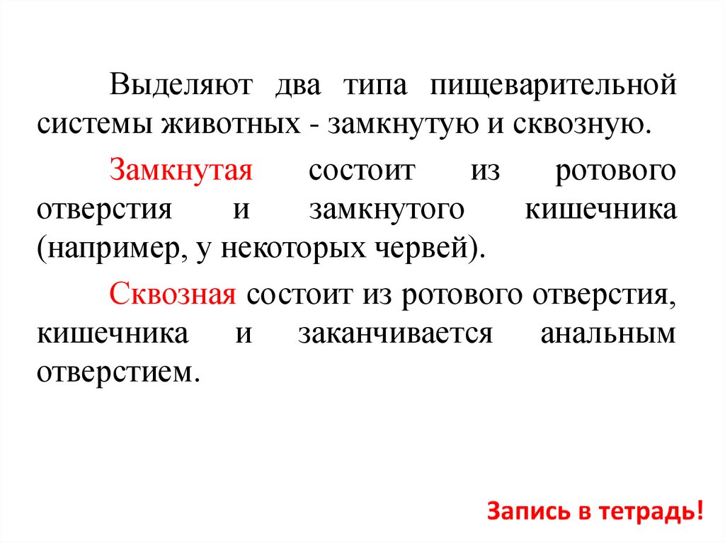 Выделяют два типа пищеварительнойсистемы животных - замкнутую и сквозную.