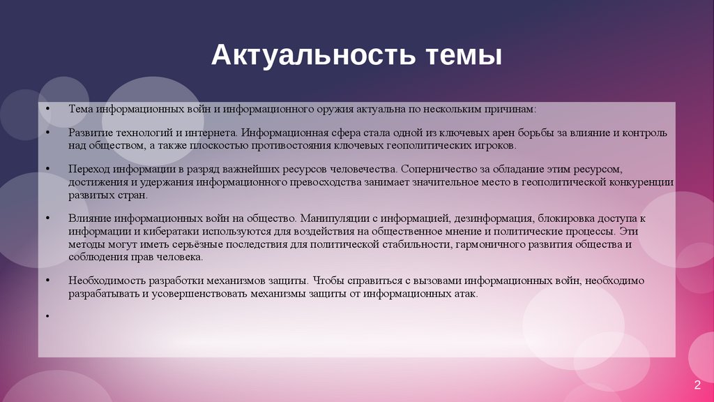 Актуальность темыТема информационных войн и информационного оружия актуальна по нескольким причинам: