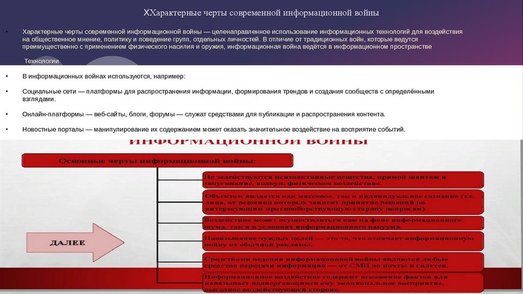 ХХарактерные черты современной информационной войныХарактерные черты современной информационной войны — целенаправленное использование информационных технологий для воздействия