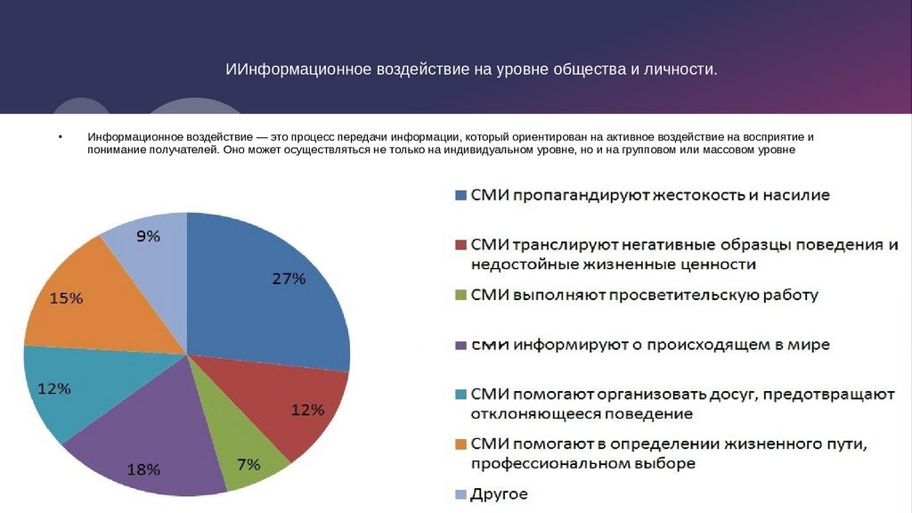 ИИнформационное воздействие на уровне общества и личности.Информационное воздействие — это процесс передачи информации, который ориентирован на активное воздействие на восприятие и