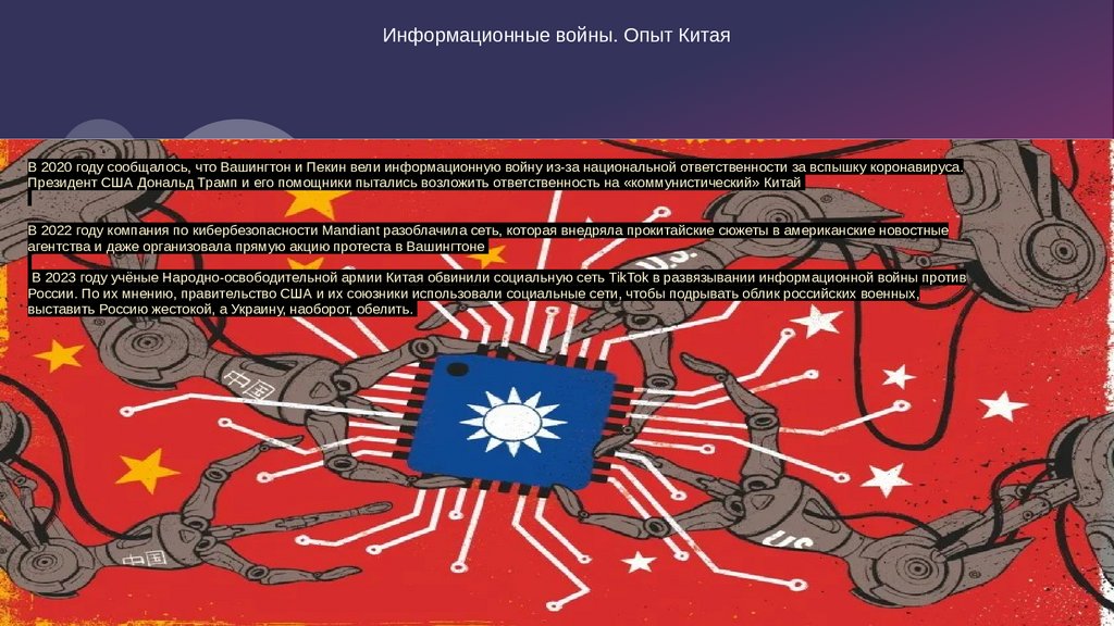 информации и кибератаки используются для воздействия на общественное мнение и политические процессы. Эти