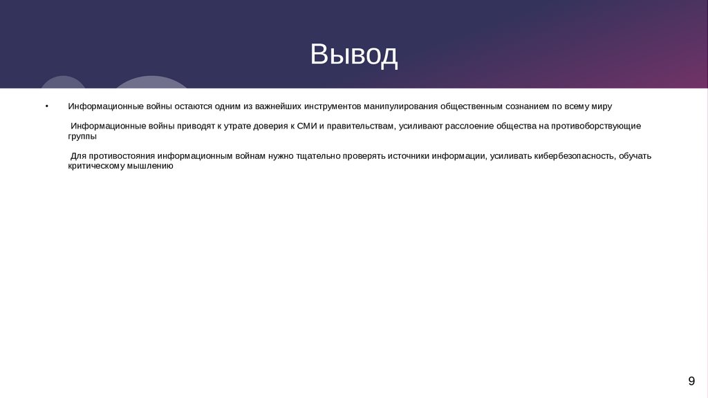 ВыводИнформационные войны остаются одним из важнейших инструментов манипулирования общественным сознанием по всему миру