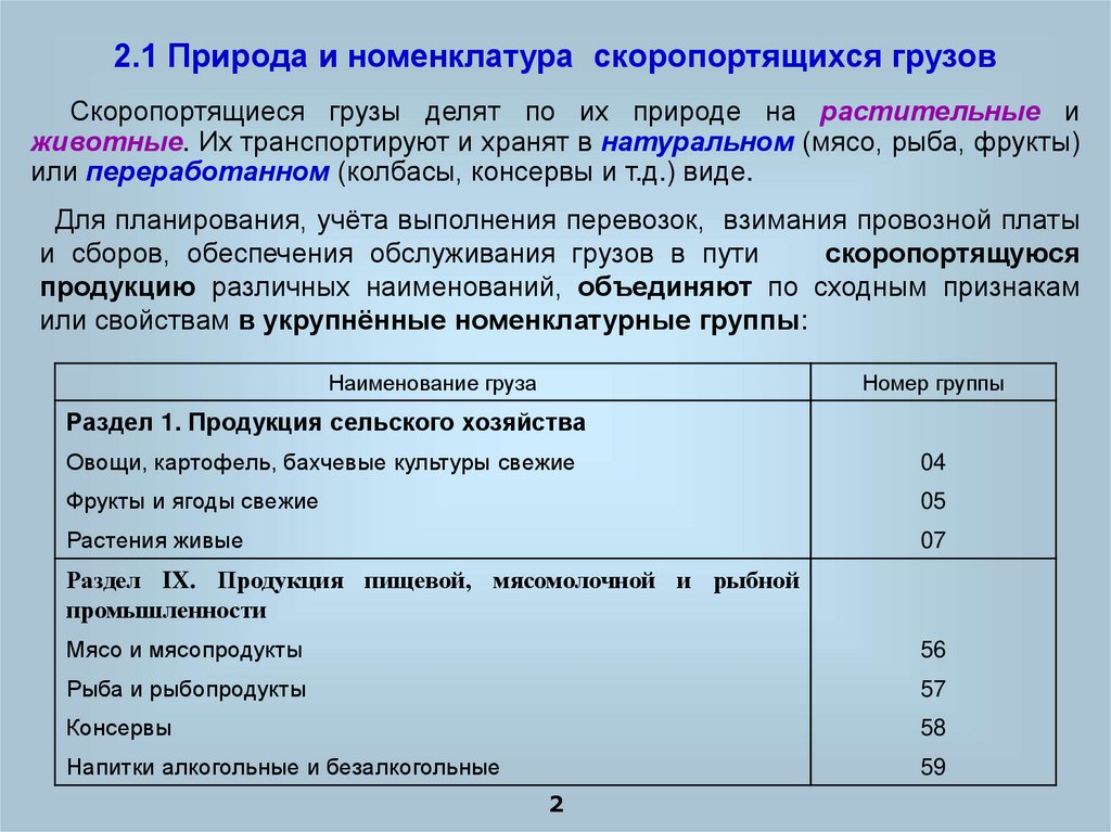 2.1 Природа и номенклатура скоропортящихся грузовСкоропортящиеся грузы делят по их природе на растительные и