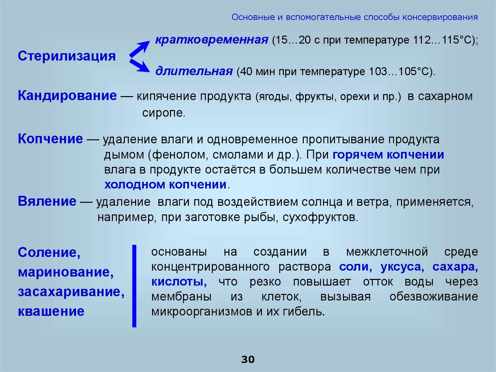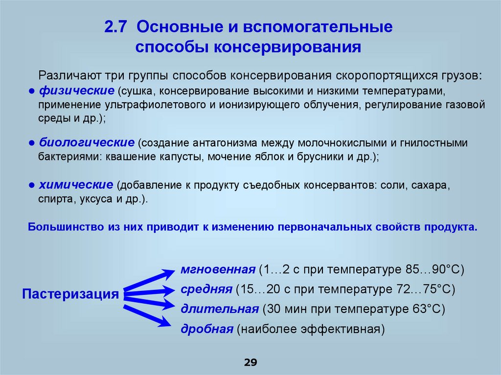 Основные и вспомогательные способы консервированиякратковременная (15…20 с при температуре 112…115°С);