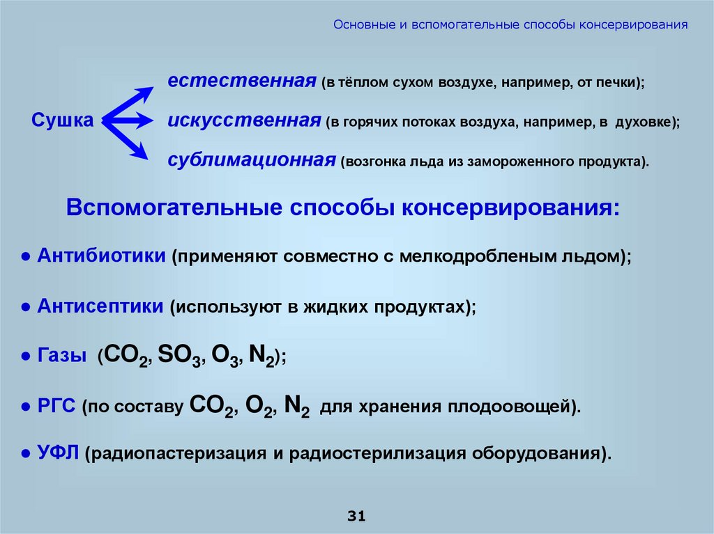 Основные и вспомогательные способы консервированияестественная (в тёплом сухом воздухе, например, от печки);