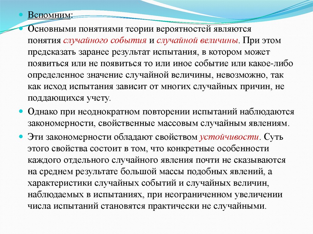 Пусть производится большая серия однотипных опытов.Исход каждого отдельного опыта является случайным,