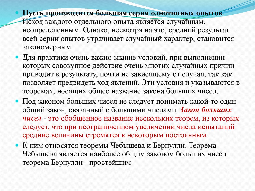 К ним относятся теоремы Чебышева и Бернулли. Теорема