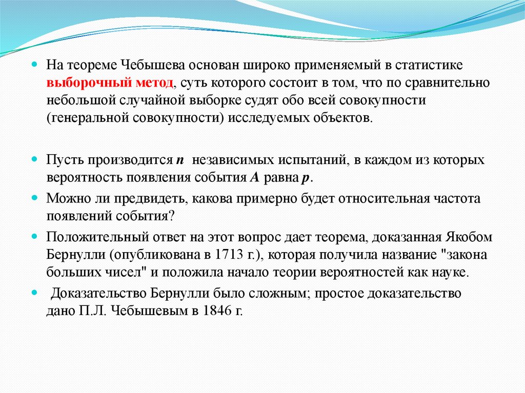 Итак, теорема Чебышева указывает условия, при которых описанный способ