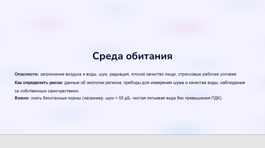 Важно: знать безопасные нормы (например, шум < 55 дБ, чистая питьевая вода без превышения ПДК).