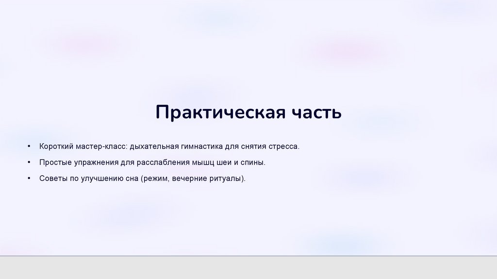 Практическая частьКороткий мастер-класс: дыхательная гимнастика для снятия стресса.