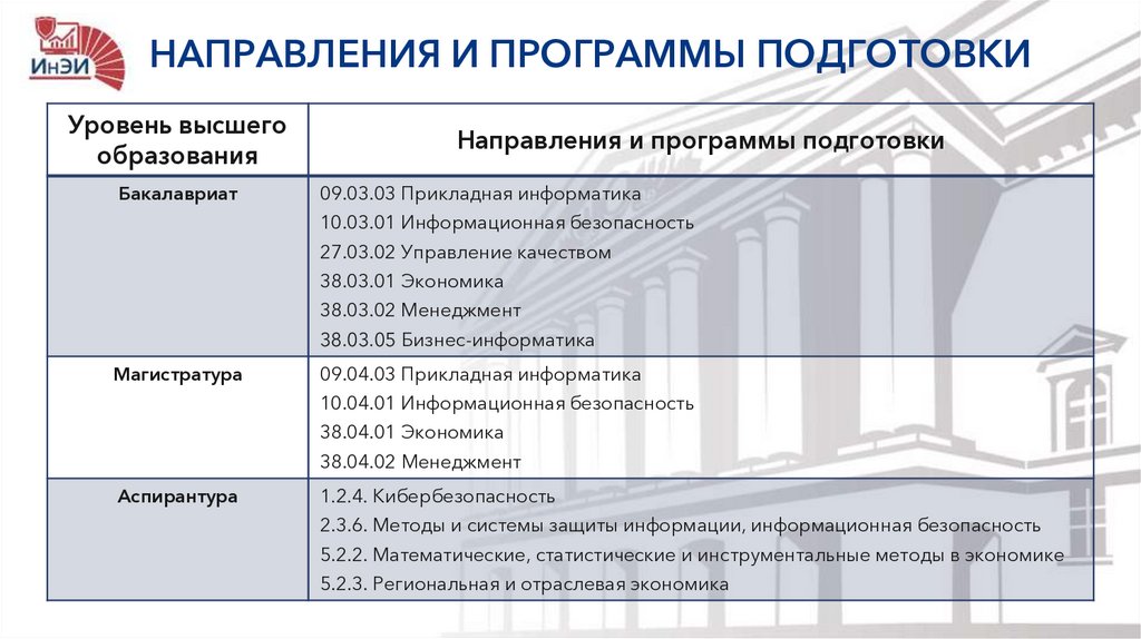 НАПРАВЛЕНИЯ И ПРОГРАММЫ ПОДГОТОВКИУровень высшего