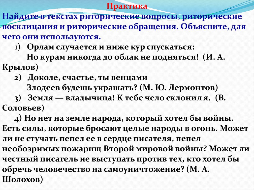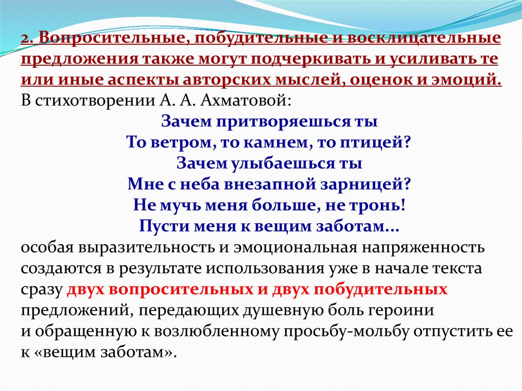 2. Вопросительные, побудительные и восклицательныепредложения также могут подчеркивать и усиливать те