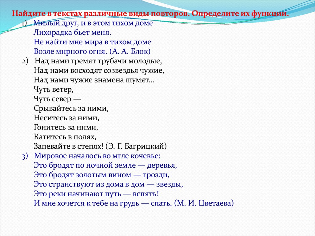 Например, в стихотворении А. А. Блока «Ночь,
