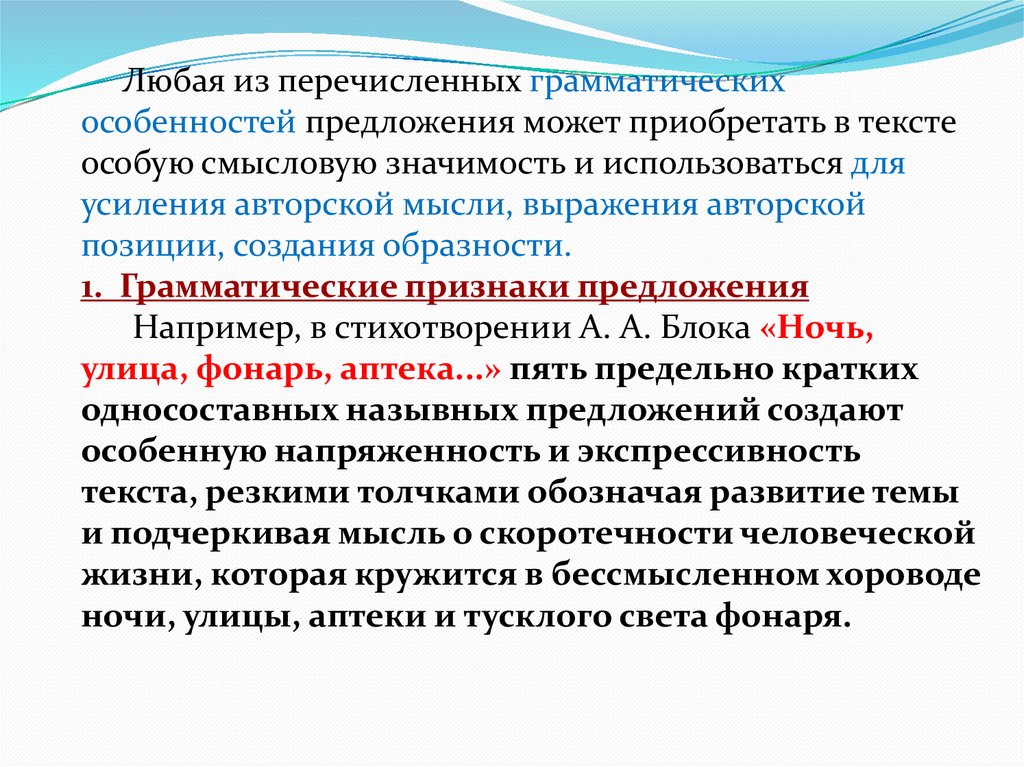 Любая из перечисленных грамматическихособенностей предложения может приобретать в тексте