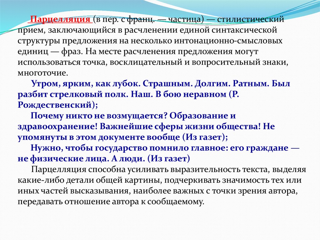 Парцелляция (в пер. с франц. — частица) — стилистическийприем, заключающийся в расчленении единой синтаксической