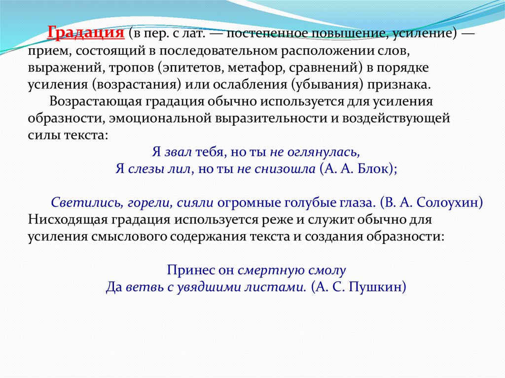 Градация (в пер. с лат. — постепенное повышение, усиление) —прием, состоящий в последовательном расположении слов,