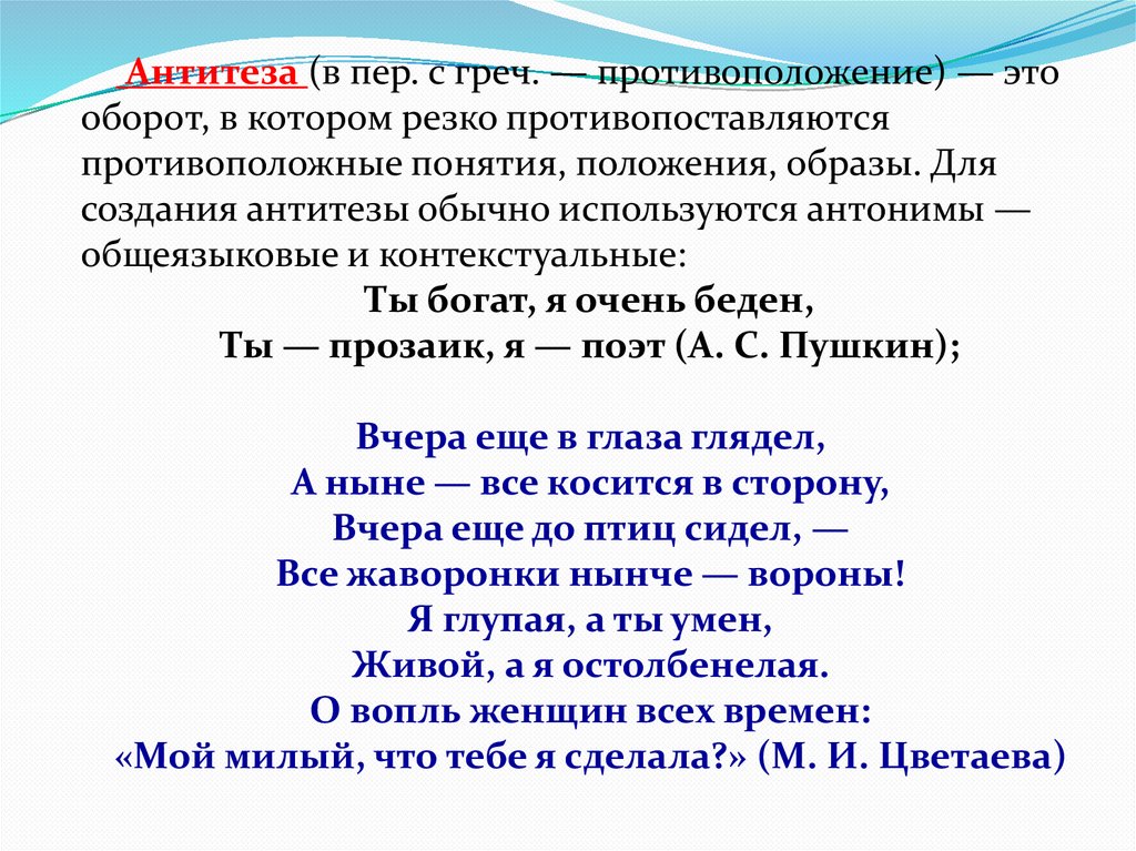 Антитеза (в пер. с греч. — противоположение) — этооборот, в котором резко противопоставляются