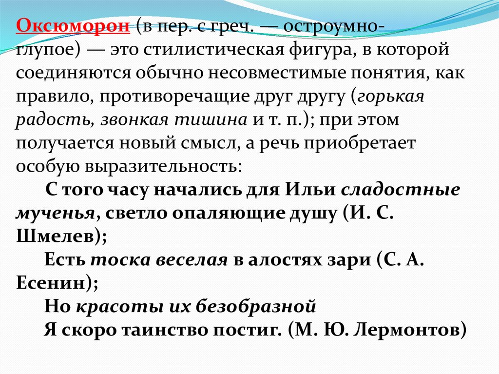 Оксюморон (в пер. с греч. — остроумноглупое) — это стилистическая фигура, в которойсоединяются обычно несовместимые понятия, как