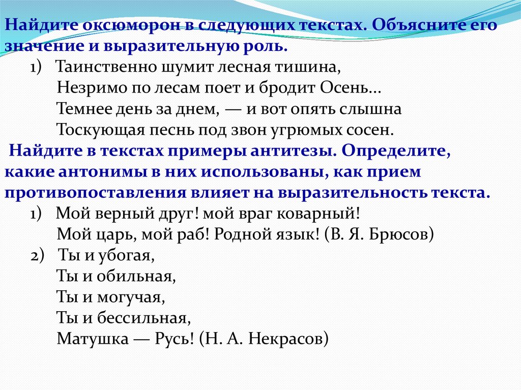 Найдите оксюморон в следующих текстах. Объясните егозначение и выразительную роль.