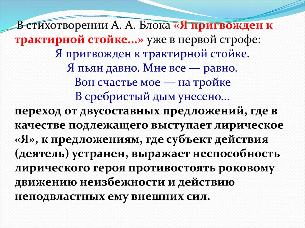 В стихотворении А. А. Блока «Я пригвожден ктрактирной стойке...» уже в первой строфе: